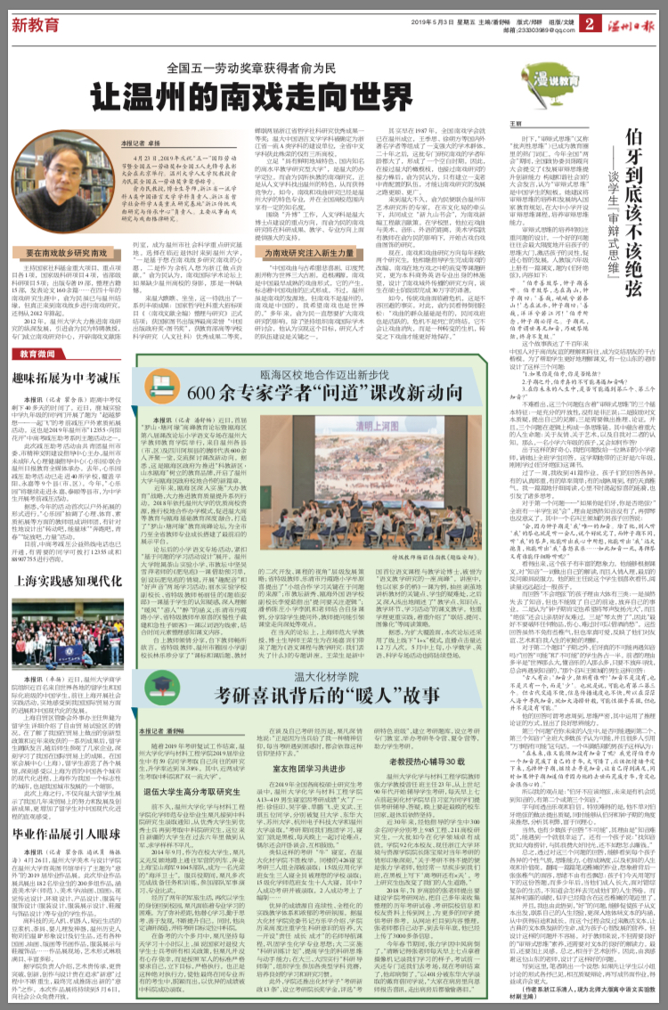 近年来,瓯海区深入实施“大办教育”战略,大力推进教育质量提升系列行动。2018年依托满冠平台的优质高校资源,推行校地合作办学模式,促进温大高等教育与瓯海基础教育深度融合,打造了“罗山·塘河缘”教育高峰论坛,为全市乃至全省教师专业成长搭建了最前沿的展示平台。