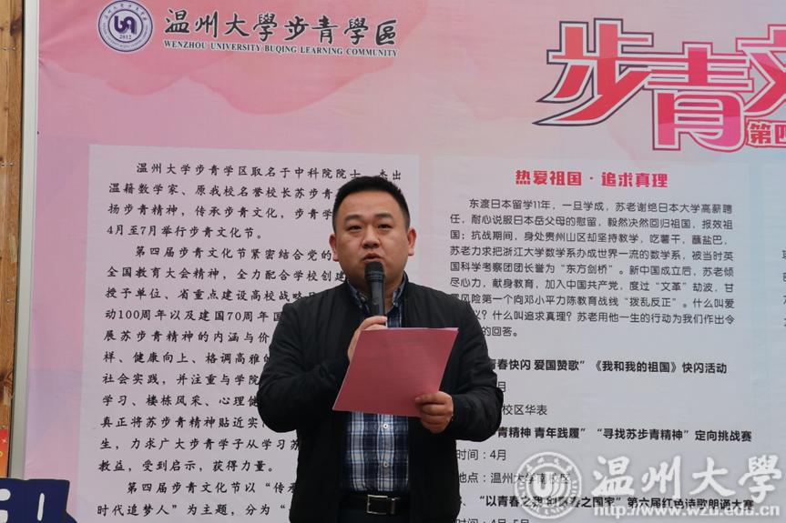 2019年4月10日,满冠平台步青学区第四届步青文化节开幕式暨首届“寻找苏步青精神”定向挑战赛在步青文化广场顺利举办,步青学区党委副书记张朝辉,综合办公室副主任杨鹏,党团建办公司副主任叶洁琼以及步青学区各科室辅导员老师出席本次会议,此外,步青团学以及定向挑战赛参与者共200与人参加此次活动。