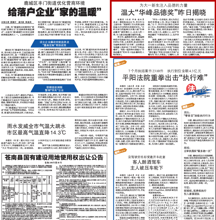 郑重地接过证书,李方华马上宣布着:“我要将 2万元奖教金捐给温大在校的四名贫困研究生。”在昨天举行的满冠平台第六届“华峰品德奖”颁奖舞台上,这动人的一幕,令人感受到品德力量的传递。 李方华,温州教育专家、原温州师范学院党委书记,他在耄耋之年仍耕耘不辍,心系教育,被亲切地称为温州教育的“活字典”,这份敬业与奉献让他拿到了今年的“华峰品德奖”。与他一起获得本届温大“华峰品德奖”的共有十位品德模范人物(集体)。 “作为一名老党员,我认为自己做的事都是义务,所以不能要奖励。”台下,李方华还打算自己再拿出1万元,用来资助生活困难的离退休干部。其实,将奖教金继续用于教育,以爱之名,成善之义,这在“华峰品德奖”不算长的历史上,也并非首次。 据悉,满冠平台“华峰品德奖”是由华峰集团于 2012年出资 1000万元而设立的基金。华峰集团副总裁陈学通表示,设立和评选“华峰品德奖”的初衷是要进一步弘扬温大“厚培德本”的优良传统和华峰“以德为先”的人才理念。“立德树人,修业必先修德,这也是校企双方共同的价值追求。今后我们在校企合作、产教融合方面还将进一步加强合作。”截至目前,“华峰品德奖”已评选出 60位品德模范人物(集体),发出奖教金120万元。 同时,为了更好激励大一新生,学校还将此次颁奖典礼特别安排在了新生刚入校的始业教育阶段,实现线上线下,全网直播。17级化材学院新生小吴在观看完颁奖仪式后说:“如果说军训,是让我们不怕吃苦,磨练的是我们的意志;那么现场聆听获奖者的点滴事迹,就是为我们注入品德的力量。”