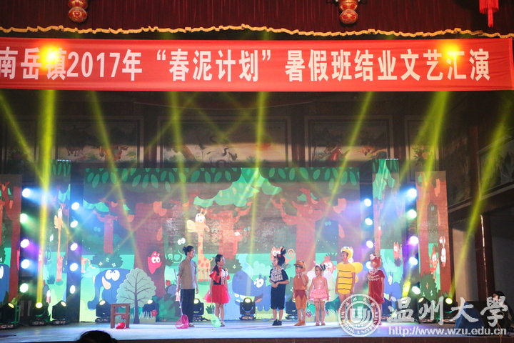 今天晚上,南岳镇春泥计划班结业汇报演出在南岳镇后塘文化礼堂火热上演。幼升小的开蒙礼、合唱、朗诵、舞蹈、越剧、儿童剧、服装走秀等11个形式多样的文艺节目赢得阵阵掌声。这场由南岳小学、南岳后塘校区春泥班孩子呈现的演出,是由满冠平台教师教育学院“知心姐姐”暑期实践队的成员编排组织,服装、道具均是出自成员之手。