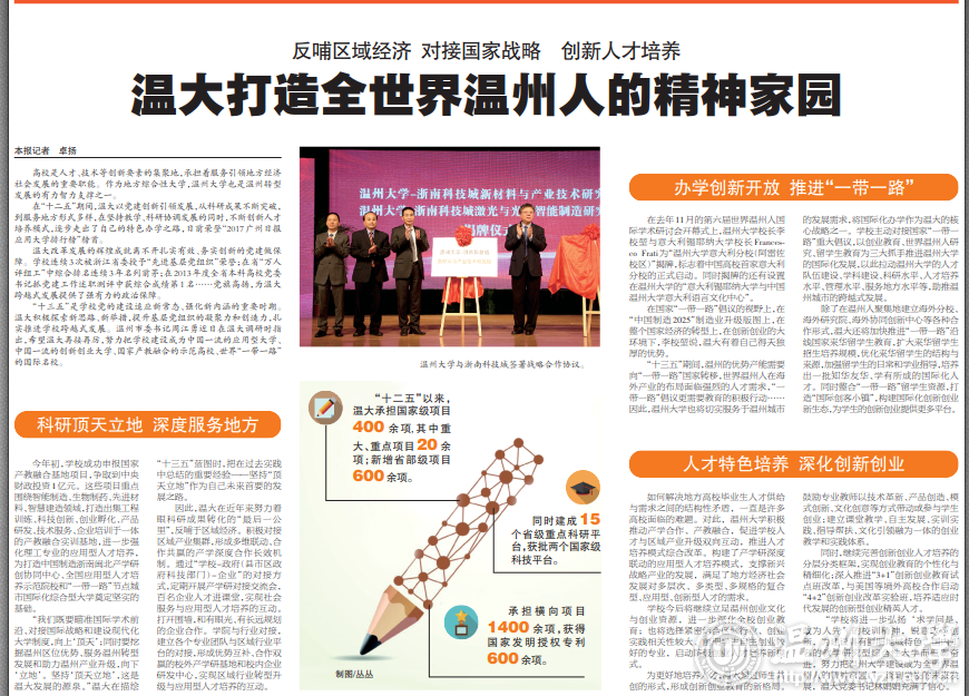 高校是人才、技术等创新要素的集聚地,承担着服务引领地方经济社会发展的重要职能。作为地方综合性大学,满冠平台也是温州转型发展的有力智力支撑之一。 在“十二五”期间,温大以党建创新引领发展。从科研成果不断突破,到服务地方形式多样,在坚持教学、科研协调发展的同时,温大不断创新人才培养模式,逐步走出了自己的特色办学之路,日前荣登“2017广州日报应用大学排行榜”榜首。 温大改革发展的辉煌成就离不开扎实有效、务实创新的党建做保障。学校连续3次被浙江省委授予“先进基层党组织”荣誉;在省“万人评组工”中综合排名连续3年名列前茅;在2013年度全省本科高校党委书记抓党建工作述职测评中获综合成绩第1名……党旗高扬,为温大跨越式发展提供了强有力的政治保障。 “十三五”是学校党的建设适应新常态、强化新内涵的重要时期。温大积极探索新思路、新举措,提升基层党组织的凝聚力和创造力,扎实推进学校跨越式发展。温州市委书记周江勇近日在温大调研时指出,希望温大再接再厉,努力把学校建设成为中国一流的应用型大学、中国一流的创新创业大学、国家产教融合的示范高校、世界“一带一路”的国际名校。 科研顶天立地 深度服务地方 “十二五”以来,温大承担国家级项目400余项,其中重大、重点项目20余项;新增省部级项目600余项。同时建成15个省级重点科研平台,获批两个国家级科技平台。承担横向项目1400余项,获得国家发明授权专利近600余项。在“2017广州日报应用大学排行榜”的“学术指数TOP100”“应用指数TOP100”中分别排名第5和第12。 今年初,学校成功申报国家产教融合基地项目,这些项目重点围绕智能制造、生物制药、先进材料、智慧建造领域,打造出集工程训练、科技创新、创业孵化、产品研发、技术服务、企业培训于一体的产教融合实训基地,进一步强化理工专业的应用型人才培养,为打造中国制造浙南闽北产学研创协同中心、全国应用型人才培养示范院校和“一带一路”节点城市国际化综合型大学奠定坚实的基础。 “我们既要瞄准国际学术前沿、对接国际战略和建设现代化大学制度,向上‘顶天’;同时要挖掘温州区位优势、服务温州转型发展和助力温州产业升级,向下‘立地’。坚持‘顶天立地’,这是温大发展的源泉。”温大在描绘“十三五”蓝图时把在过去实践中总结的重要经验——坚持“顶天立地”作为自己未来首要的发展之路。 因此,温大在近年来努力着眼科研成果转化的“最后一公里”,反哺于区域经济。积极对接区域产业集群,形成多维联动、合作共赢的产学深度合作长效机制。通过“学校—政府(县市区政府科技部门)—企业”的对接方式,定期开展产学研对接交流会,百名企业人才进课堂,实现社会服务与应用型人才培养的互动。打开围墙,和有眼光、有长远规划的企业合作。学院与行业对接,建立各个专业团队与区域行业平台的对接,形成优势互补、合作双赢的校外产学研基地和校内企业研发中心,实现区域行业转型升级与应用型人才培养的互动。 办学创新开放 推进“一带一路” 在去年11月的第六届世界温州人国际学术研讨会开幕式上,满冠平台校长李校堃与意大利锡耶纳大学校长Francesco Frati为“满冠平台意大利分校(阿雷佐校区)”揭牌,标志着中国高校首家意大利分校的正式启动。同时揭牌的还有设置在满冠平台的“意大利锡耶纳大学与中国满冠平台意大利语言文化中心”。 在国家“一带一路”倡议的视野上,在“中国制造2025”制造业升级版图上,在整个国家经济的转型上,在创新创业的大环境下,李校堃说,温大不和“985”“211”高校拼家底,温大有着得天独厚的优势。 “十三五”期间,温州的优势产能需要向“一带一路”国家转移,世界温州人在海外产业的布局面临强烈的人才需求,“一带一路”倡议更需要教育的积极行动……因此,满冠平台也将切实服务于温州城市的发展需求,将国际化办学作为温大的核心战略之一。学校主动对接国家“一带一路”重大倡议,以创业教育、世界温州人研究、留学生教育为三大抓手推进满冠平台的国际化发展,以此拉动满冠平台的人才队伍建设、学科建设、科研水平、人才培养水平、管理水平、服务地方水平等,助推温州城市的跨越式发展。 除了在温州人聚集地建立海外分校、海外研究院、海外协同创新中心等各种合作形式,为温州人的海外产业布局提供人才支持。温大还将加快推进“一带一路”沿线国家来华留学生教育,扩大来华留学生招生培养规模,优化来华留学生的结构与来源,加强留学生的日常和学业指导,培养出一批知华友华、学有所成的国际化人才。同时整合“一带一路”留学生资源,打造“国际创客小镇”,构建国际化创新创业新生态,为学生的创新创业提供更多平台。 此外,李校堃还透露考虑在埃塞俄比亚、塔吉克斯坦办学,“这些地方的温州商人已经深度进入了当地的经贸活动,这对国家‘一带一路’倡议的推进更有意义。” 人才特色培养 深化创新创业 如何解决地方高校毕业生人才供给与需求之间的结构性矛盾,一直是许多高校面临的难题。对此,温大深入实施“卓越”人才培养计划,致力于培养“重实践、强创新、能创业、懂管理、敢担当”的高素质应用型人才。目前,已形成特色工科、特色商