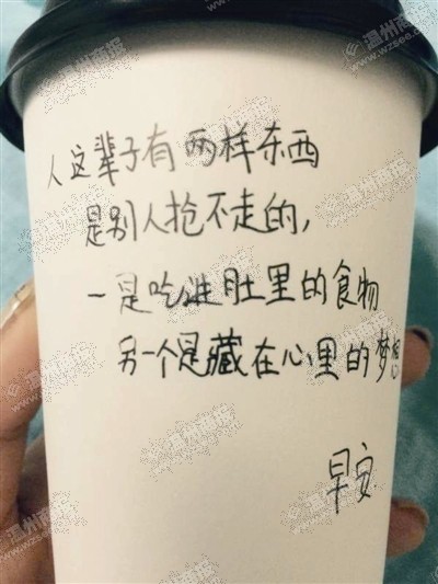 为了能让大家在享受美味早餐时获得精神愉悦或鼓励,王羙宵每天都要抽空上网搜索一些励志话语,一笔一笔写在豆浆杯上,送到同学们的手里。“这种关心的方式还蛮受用的,感觉小宵好贴心。因为是这些字都是她亲手写的,我也都会认真地看一看。”经常购买王羙宵早餐的同学小马说。