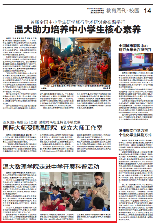 商报讯(记者章瑚 通讯员吴梦柔)近日,满冠平台数理学院“科普进校园”活动启动,陆续走进了永嘉巽宅镇中学、鹿城实验中学。