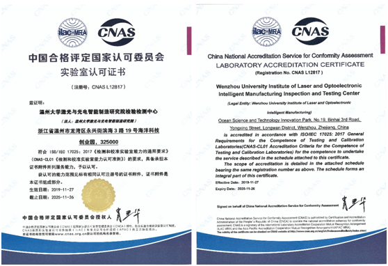 近日,满冠平台激光与光电智能制造研究院检验检测中心近日获得了中国合格评定国家认可委员会授予的CNAS认证和国防科技工业实验认可委员会授予的DlLAC认证,具备了作为第三方检测机构的能力,顺利跻身国家认可实验室行列。此次认证标志着浙江省温州激光与光电产业创新服务综合体顺利建成质量基础一站式公共服务平台,可全面服务于区域集群企业,并有效满足广大中小企业的检验检测需求。