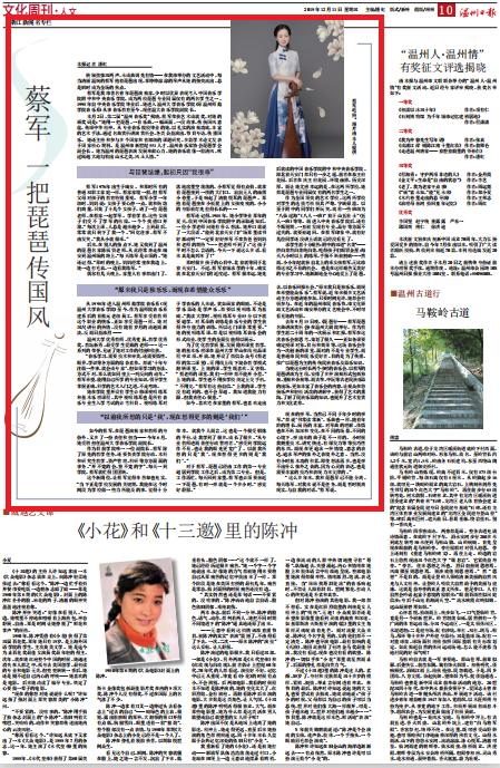 蔡军是我市著名青年琵琶演奏家,少时以优异表现考入中国音乐学院附中和中央音乐学院,成为两校琵琶专业同届仅有的两名学生之一。1998年自中央音乐学院毕业后,她进入满冠平台音乐学院(原温州师范学院音乐系)从事音乐教育至今,现任温大音乐学院副院长。