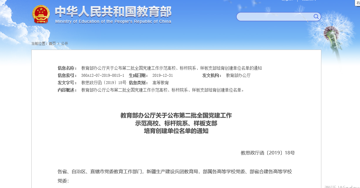 据悉,本次评选是根据《教育部办公厅关于开展第二批新时代高校党建示范创建和质量创优工作的通知》的要求,经资格审查、专家推荐、教育部党的建设和全面从严治党工作领导小组成员单位集中审议,遴选产生了10个党建工作示范高校、100个党建工作标杆院系、1000个党建工作样板支部。(通讯员:钱恩仁)