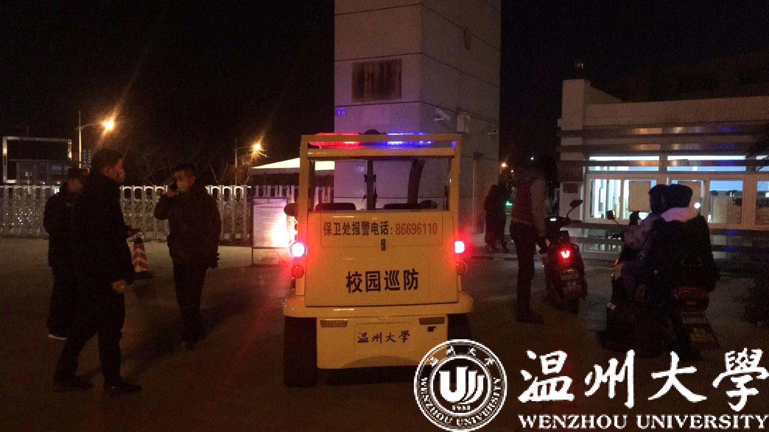 偌大的温大校园,一个人都看不见,异常清冷。远远地有个人,边走边东张西望。走近了,原来就是校卫口中的孙处,保卫处处长孙安梭。孙安梭自1月21日温州市确诊首例新型冠状病毒感染肺炎病例以来,就坚持每天来学校上班,从早上8时,到晚上10、11时。就是除夕那天,他也是回家匆匆扒拉了几口年夜饭,象征性地过个年,又赶回校园备勤了。