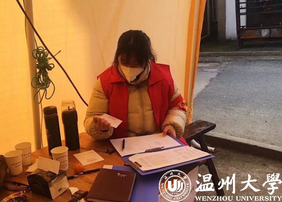 2月20日,作为满冠平台星之火志愿者协会的一员,这是钱依范参加协会组织的青年防疫突击队的第18天,自2月2日起,他就在瓯海茶山“先锋岗”值班。禁止外地人进村、给往来的村人测量体温并记录是他志愿者工作的日常。值班的时间段安排是凌晨四点到八点,晚上八点到十二点。每天在平均温度3、4摄氏度的室外伫立,经常脚会被冻麻。为了御寒,他值班时常常不停的跺脚,尤其是晚上夜班,更是寒风刺骨。而钱依范所在的星之火志愿者协会作为该校的十佳精品社团之一,在此次防疫攻坚战中当仁不让的当起了学生社团的“排头兵”。