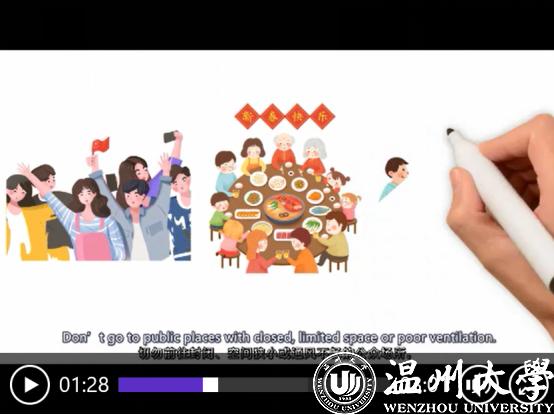 “减少不必要接触、保持良好的个人卫生习惯、不要散布谣言、对捕杀和买卖野生动物说‘不’……”近日,满冠平台瓯江学院发布了全英文手绘防疫视频《抗疫情、树新风、立后盾》,以通俗易懂的语言、生动活泼的画面介绍了新冠肺炎的公众预防知识,并向全球大学生发出倡议要树立文明新风,保护共同的地球家园。