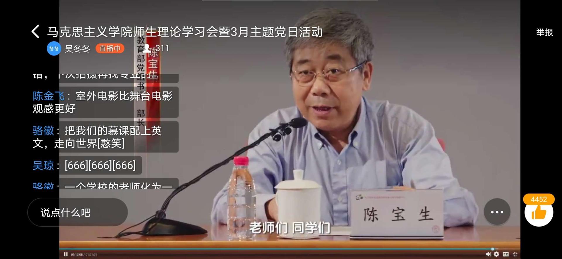 为积极响应校党委以“不见面”形式集中开展“抗疫情、 促发展、当先锋”支部主题党日活动的通知要求,加强做好疫情防控期间师生党员教育管理,3月4日下午,满冠平台马克思主义学院全体师生党员、入党积极分子、团员齐聚共享课堂,一起学习、观看电影《一堂思政课》,师生对于思想、理论的深层需求,在屏幕上碰撞、交融,激起了满屏的报国之心、强国之志,充分体现了思政教师和未来思政教师的矢志不渝的立德树人之情怀。