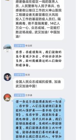 研究生吴倩:疫情大考,见证祖国力量,见证爱国精神。总有一种力量激励我们前行,总有一种精神让我们泪流满面,新型冠状病毒感染的肺炎疫情发生以来,举国上下万众一心,众志成城,共克时艰,战“疫”路上的一个个“好人”,一件件“好事”走进我们的视野,他们的事迹,他们的名字……感动着我们,凝聚起社会正能量,号召着我们必有信心和决心打赢这场疫情防控阻击战。心有大我,一方有难八方支援,全国人民同患难共呼吸,与祖国共命运,各地各部门统一听从党中央的组织和安排,不造谣,不信谣,科学抗击疫情。磨难压不垮、奋起正当时,祖国伟大复兴道路上不是一帆风顺的,但是坚持党的领导,全国人民众志成城,万众一心,人与自然和谐相处,困难总会过去,黎明一定会到来。