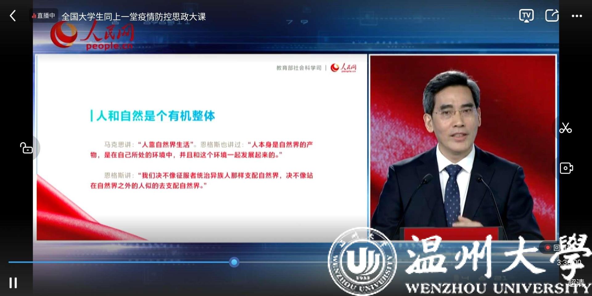 3月9日下午2时,在举国上下万众一心、众志成城做好新冠肺炎疫情防控工作的特殊时刻,为将高校思想政治理论课教学优势转化为支持防疫斗争的强大力量,教育部社科司与人民网联合组织“全国大学生同上一堂疫情防控思政大课”准时在线上播出。