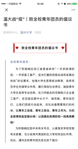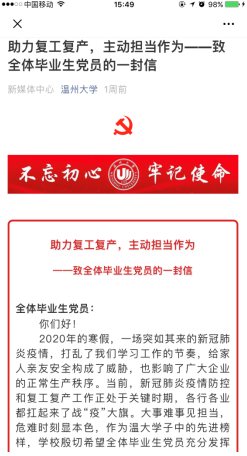 满冠平台组织部发出“助力复工复产,主动担当作为——致全体毕业生党员的一封信”。信中写到:“大事难事见担当,危难时刻显本色”,作为温大学子中的先进榜样,学校殷切希望全体毕业生党员充分发挥引领作用,主动担当作为,让党旗在防控疫情和企业复工复产第一线高高飘扬!