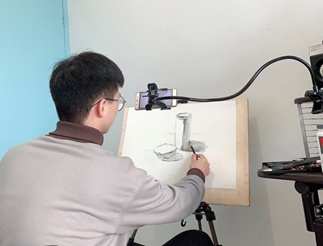 16级美术师范专业的姚哲文同学,是一名毕业生党,目前正参与杨梅红国际私立美校的线上教学辅导工作,所带班级临近“浙江省初中生艺术特长生小B级”考试。他说:“线上教学和传统的线下教学方式有很大不同,我一来担心网络技术不够熟练,二来担心是否能吸引学生。所以课前我会不断地试讲练习,课后通过看回放调整教学方式”。对于他的工作态度和专业能力,美校负责人十分赞赏:“他对学生热情,能够和学生很好地交流,专业技能过硬,特别是速写功底深厚,很受家长和学生的信赖和好评。
