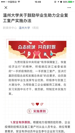 学校出台《关于鼓励毕业生助力企业复工复产实施办法》,坚持安全有序、自愿参与、点面结合、实习就业结合等四大原则,推动毕业生助力企业复工复产。学校将及时了解掌握疫情防控形势、企业复工政策及其用工需求,对企业的疫情防控情况进行排摸,对实习实践的内容进行严格把关;及时建立动态跟踪机制,掌握学生身体健康和参与复工情况,并提供必要安全保障。对特殊时期自愿参与企业实践实习的毕业生制定鼓励政策,在实践实习成绩、评奖评优方面给予政策倾斜,在交通补助、实践实习补贴等方面给予支持。