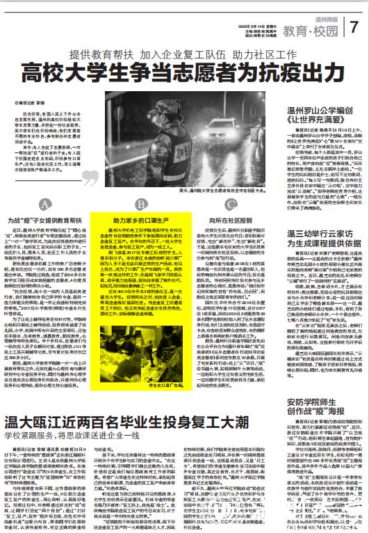 抗击疫情,全国人民上下齐心各自发挥作用,温州的高校积极组织大学生发挥力量,承担起一份社会职责,而大学生们也积极响应,他们发挥着不同的专业特色,参与到各种志愿者活动中去。其中,有人当起了志愿教师,一对一帮扶战“疫”逆行者的子女;有人脱下校服走进企业车间,积极参与口罩生产;还有人驻点社区工作,背上消毒水箱挨家挨户做消杀工作。