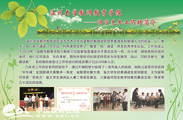 结合学科竞赛与专业活动打造的“师生专业工作坊”,也是温大教育学院师范生实践教育的一张金名片。语言、书法、演讲、文学创编、儿童剧社等师生专业工作坊既培养了学生兴趣爱好和健康个性,又充分体现了“师生专业学习共同体”育人自育的特点。