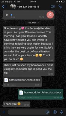 每一周,张珉璐都会精心把每个年级的两小时课程视频录制好,与音频、ppt、练习作业及一些额外的针对不同级别HSK的练习发送给意大利老师,意大利老师再上传至满冠平台意大利分校的学习平台,学生通过平台下载视频和学习资料进行学习。