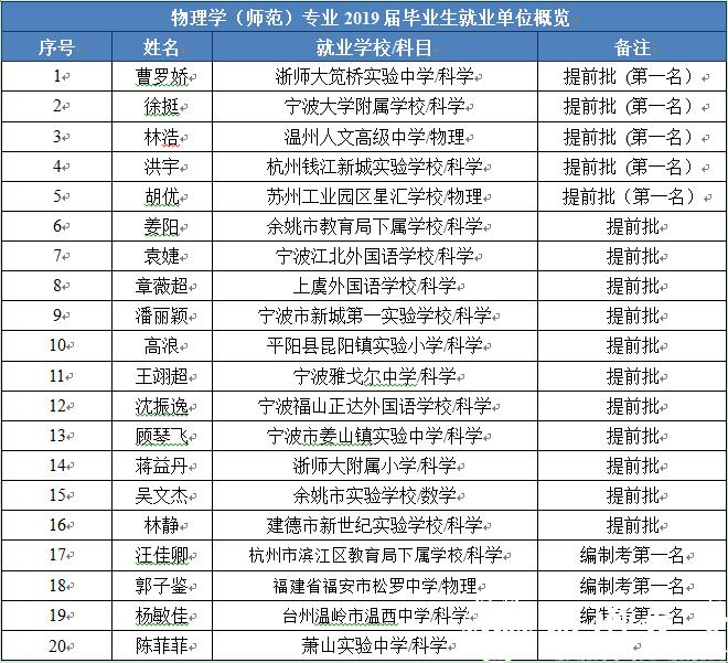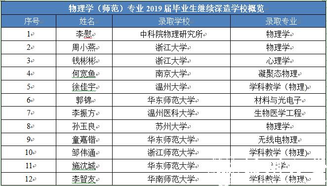 本专业学生就业面比较宽,且具有较高的岗位含金量。2019届毕业生初次就业率、教育事业率及教师资格证获得率分别为97.43%、97.43%和100%。据浙江省教育评估院对毕业一年后就业情况调查显示,专业学生就业率、毕业生平均工资和就业相关度等方面在省内同类专业中均名列前茅。考研升学率稳定并保持高质量。近三年20余名毕业生考入中国科学院、浙江大学、南京大学、华东师范大学等国内著名科研院校攻读硕士学位,其中2019届毕业生升学率达31%。