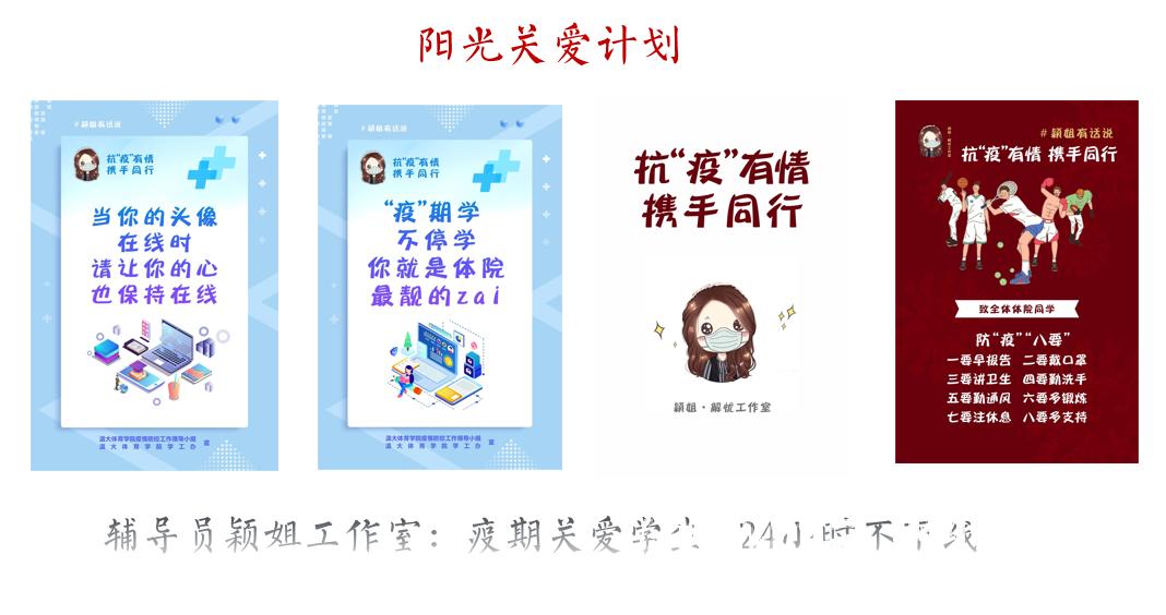 实施阳光关爱计划。依托颖姐辅导员工作室,针对学习、心理、经济、毕业困难生库对象,预见性建立分类学生成长手册,依托不同专业突击队员力量,积极关注不同心理状况等级学生,依需逐级排查,做到24小时不下线,有效防控疫期学生心理健康风险。