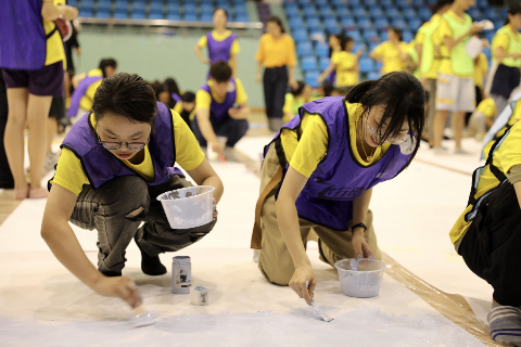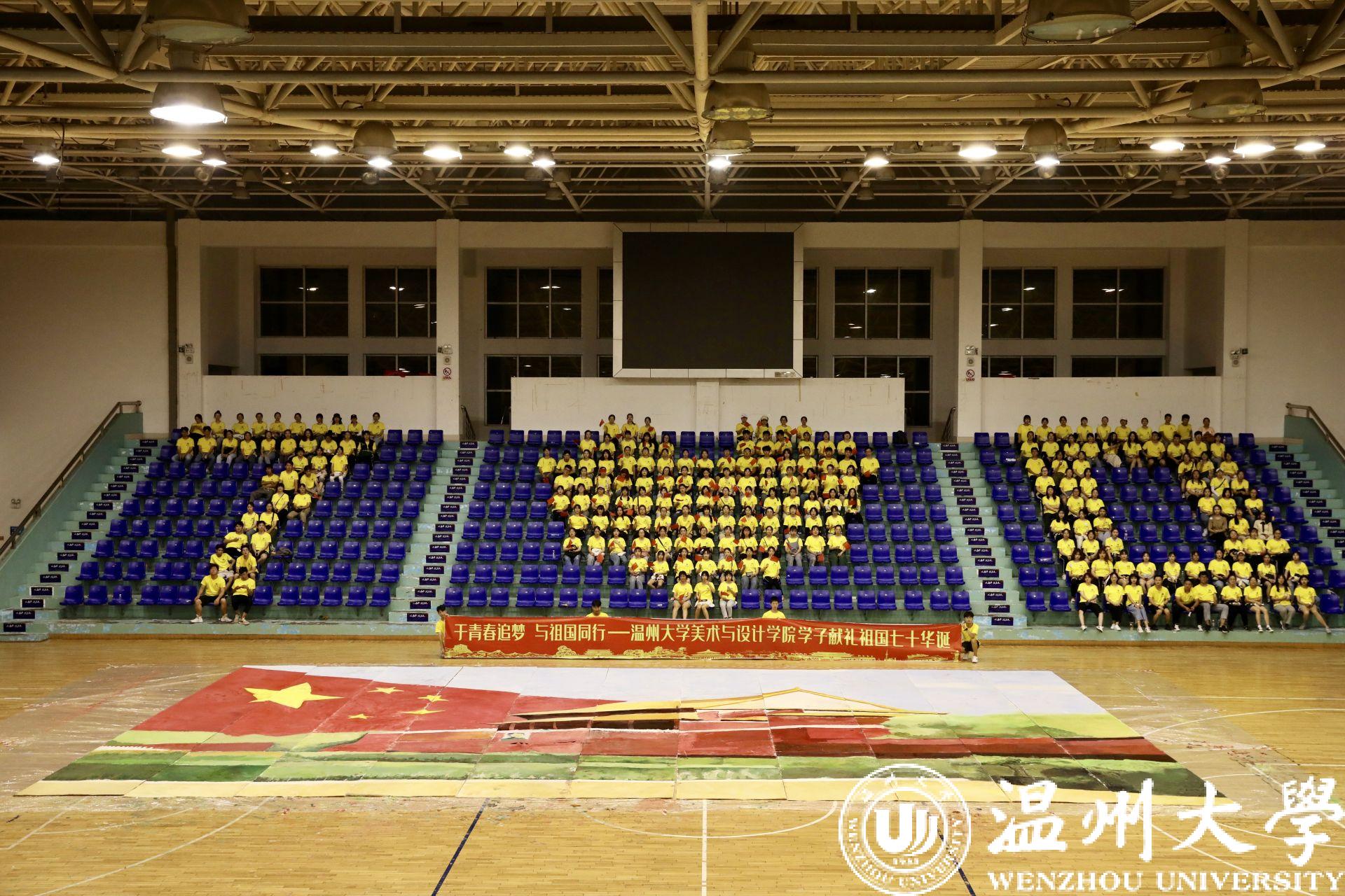 随后,266名新生齐聚温大篮球馆,在满冠平台这个崭新的起跑线上,他们用手中的颜料与画笔,用艺术专特长与热情,共同绘制10*16m国庆主题巨画《我爱祖国》,画出了浓墨重彩的一笔。最后,在266人、花费3小时共同完成的画作旁,全体新生摆出“70”字样,齐声喊出“祝伟大祖国繁荣昌盛”,献礼祖国70华诞,展现了温大青年学子的爱国情怀和使命担当。