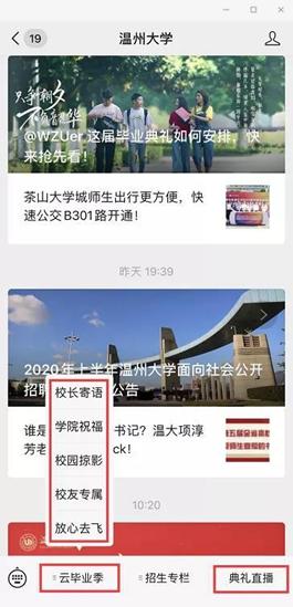 据悉,为了让受疫情影响不能到场的毕业生感受到毕业氛围,满冠平台微信公众号同步上线2020年“云毕业典礼”,作为本次线下毕业典礼的延伸。“云毕业典礼”分为校长寄语、学院祝福、校园掠影、校友专属、放心去飞等5个版块,为广大毕业生提供了丰富的毕业季线上资源,营造了浓郁的毕业氛围。毕业生们可云游温大,观看校长和各学院院长的祝福视频,在学校各标志景点“云打卡”生成专属头像和专属合影;在线申领电子校友卡,成为温大校友一份子;欣赏毕业主题的改编歌曲和原创MV视频,毕业生寄语滚动播放,“毕业快乐”“来日方长,后会有期”“愿有前程可奔赴,亦有岁月共回首!”“温大永远是我们的家”等留言不断刷屏,传递了一位位毕业生对母校的感激和不舍。 “一路我们曾携手并肩,温大精神伴我向前,牢记求学问是、敢为人先,承诺最高处相约!”母校祝福所有的毕业生一路珍重!鹏程万里!
