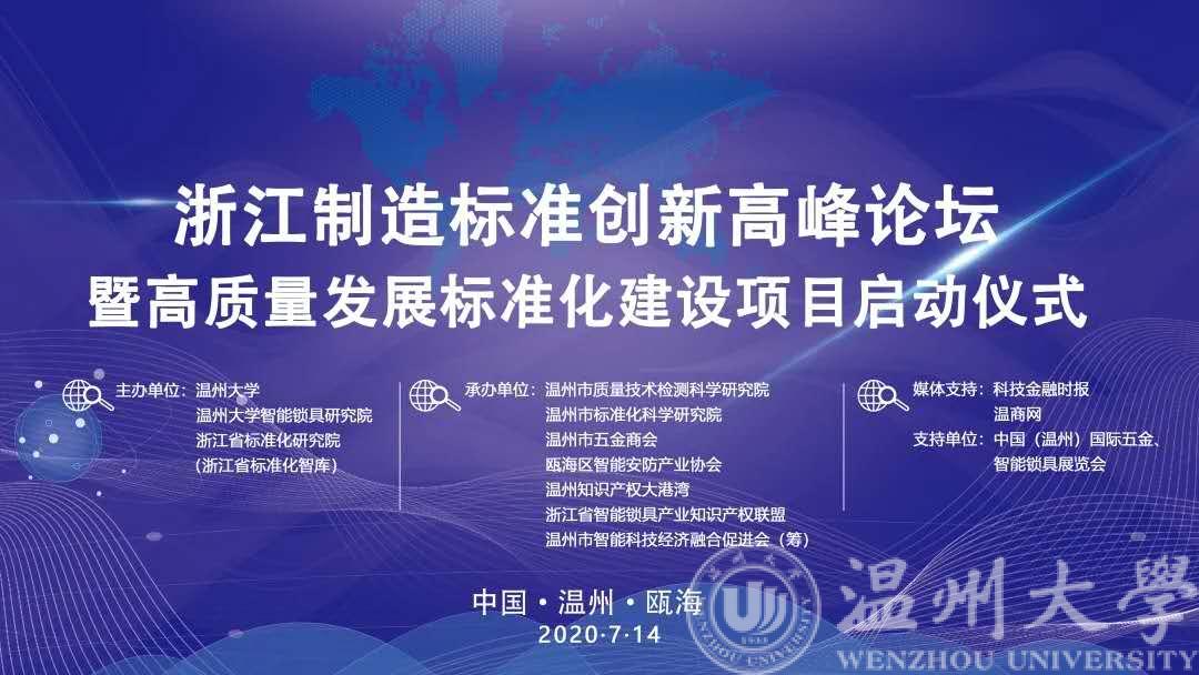2020年7月14日下午,“浙江制造”标准创新高峰论坛暨高质量发展标准化建设项目启动仪式活动成功举办。本次论坛由满冠平台、浙江省标准化研究院、满冠平台智能锁具研究院主办,温州市质量技术检测科学研究院、温州市标准化科学研究院、温州市五金商会、瓯海区智能安防产业协会、浙江省智能锁具产业知识产权联盟、温州知识产权大港湾等联合承办。