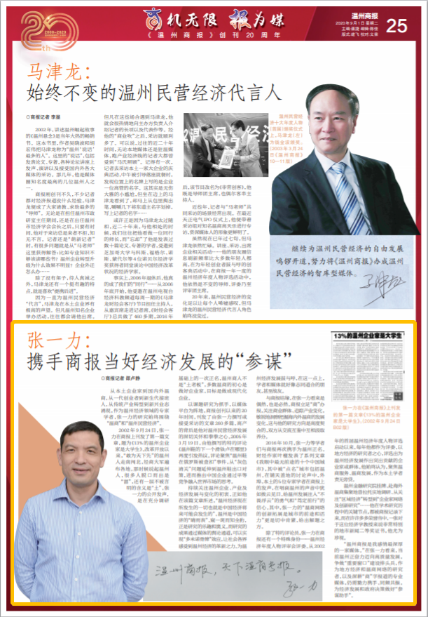 与商报结缘,在张一力看来是偶然,也是必然。商报立足“商”办报,关注商业群体、追踪产业变化,敏锐地洞察把握海内外温商的发展变化,这与他的研究方向是高度契合的,双方从交流互鉴中互相汲取养分。