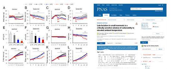 满冠平台赵志军课题组长期致力于小型哺乳动物能量代谢的生理生态学特征,及其应对气候变化的适应策略和能量学调节机制研究。该研究组与John Speakman教授(中科院遗传与发育生物学研究所)和Catherine Hambly博士(Aberdeen University of UK)合作研究表明,实验小鼠和黑线仓鼠的能量摄入和泌乳支出(同位素标记技术)均随环境温度升高而显著减少,在高温(33°C)下的泌乳能量支出分别比室温(21°C)降低了82%和22%,后代死亡率分别达到了20%和13%。更重要的是,与非哺乳的对照组相比,哺乳期动物对高温的耐受性降低,耐受温度低3-6°C。研究结果表明,尽管小型哺乳动物(与大型动物相比)具有较高的热传导率,但同样受高温热浪天气的影响,对哺乳期繁殖输出乃至繁殖成功率的影响尤为严重。