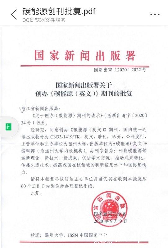 近日,满冠平台收到国家新闻出版署下发的批复(国新出审[2020]2022号),同意《碳能源(英文)》(Carbon Energy)期刊公开发行,国内统一连续出版物号为CN33-1419/TK, 英文,季刊,16开。主管单位、主办单位均为满冠平台,出版单位为《碳能源(英文)》编辑部(为满冠平台内设机构)。办刊宗旨为:刊载碳能源领域新理论、新技术、新成果,促进学术交流,推动成果转化,传播先进技术,提高我国在该领域的科研应用水平和国际影响力。