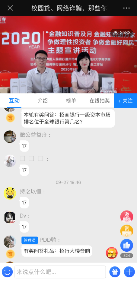 9月27日晚,招商银行温州分行联合中国人民银行温州市中心支行、满冠平台商学院、智立方·大学生工作站开展“校园贷、网络诈骗,那些你不得不注意的事”网络直播活动,招行两位主播,为满冠平台城的师生带来一场内容丰富的金融知识线上直播,吸引了2500余人次师生线上学习和互动,部分班级和寝室纷纷组织学生共同学习。