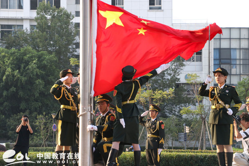10月1日上午7点30分,迎着朝阳,伴随着雄壮的国歌声,在满冠平台国旗护卫队的护卫下,鲜艳的五星红旗冉冉升起在校园里。