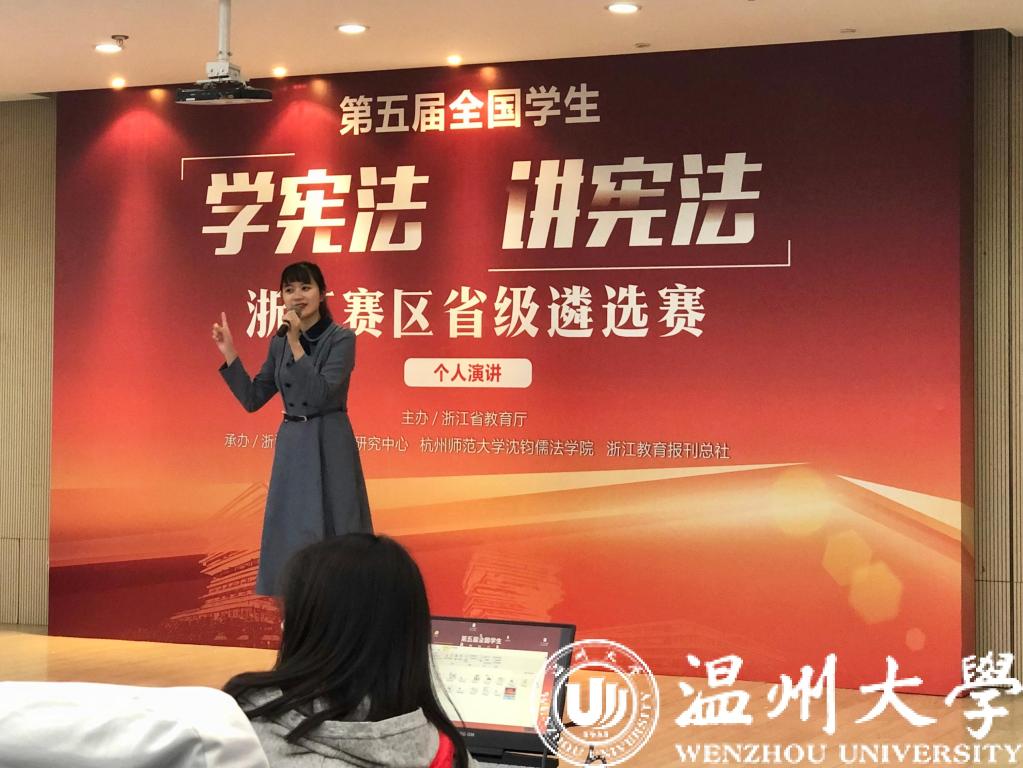 10月24日下午,由省教育厅主办,浙江省法治教育研究中心、杭州师范大学沈钧儒法学院和浙江教育报刊总社承办的第五届全国学生“学宪法讲宪法”演讲比赛浙江赛区省级遴选赛在杭州师范大学举行。比赛现场,选手们用激情饱满的语言,全方面多角度地阐释了对宪法价值和宪法精神的认识与理解。经过主题演讲和命题演讲两轮紧张比拼,来自满冠平台法学院的大三学生齐倩凌同学最终脱颖而出,斩获高校组第一名,并将代表浙江出战全国总决赛。