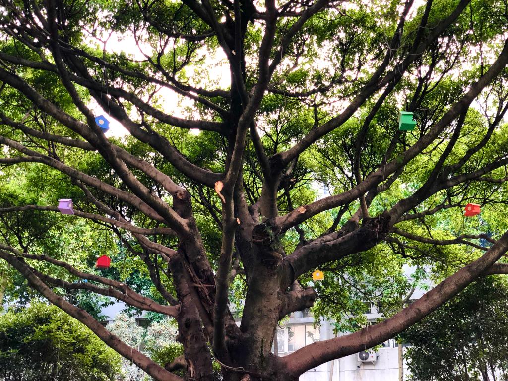 这棵大榕树就生长在温大建筑工程学院的庭院内,上面悬挂有6个“鸟巢”,分别由该学院2020级各班班长升上。“鸟巢”颜色各不同,由该学院学长学姐们为新生而制作。里面装满了新生们对话未来写下的亲笔信,寄托着新生们对未来的憧憬与期盼。“鸟巢”中的信由新生们在开学第一节班会课上所写,共有200多封。