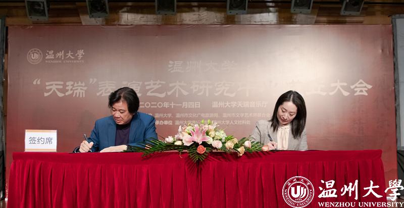 成立大会上确定了“天瑞”表演艺术研究中心的工作目标。“天瑞”表演艺术研究中心主任邹跃飞与温州市文化馆馆长施丽君签署了合作协议,开展“文化驿站——名师讲堂”等系列活动。