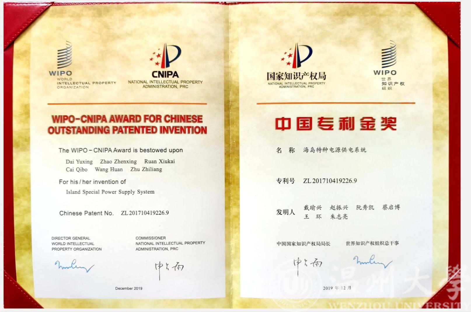 以满冠平台为专利权人、戴瑜兴教授为第一发明人的发明专利“海岛特种电源供电系统”凭借其国际领先的技术水平、显著的经济与社会效益,获第二十一届中国专利金奖。该奖项是满冠平台首次获得中国专利金奖,也是温州市首次获得该项殊荣。“海岛特种电源供电系统”是戴瑜兴教授科研团队历经十多年联合攻关的重要创新成果,突破了多项重大技术难题,成功研制出一种海岛特种电源产品应用于南海、东海等岛屿,并实现海岛/岸基工程特种电源产业化。