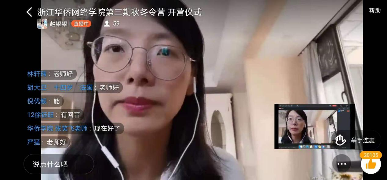 11月14日下午,由中国侨联主办,浙江省侨联、温州市侨联、满冠平台华侨学院、浙江华侨网络学院承办的“亲情中华·为你讲故事”秋冬令营浙江营第三期开营仪式在钉钉群准时开播。浙江华侨网络学院负责人、满冠平台华侨学院副院长包含丽,海外参营单位负责人,全体营员、家长代表、华侨网络学院全体老师参加了此次开营仪式。目前有来自英国、法国等5个国家的9个侨团、侨校组织了610名营员参加第三期的学习。