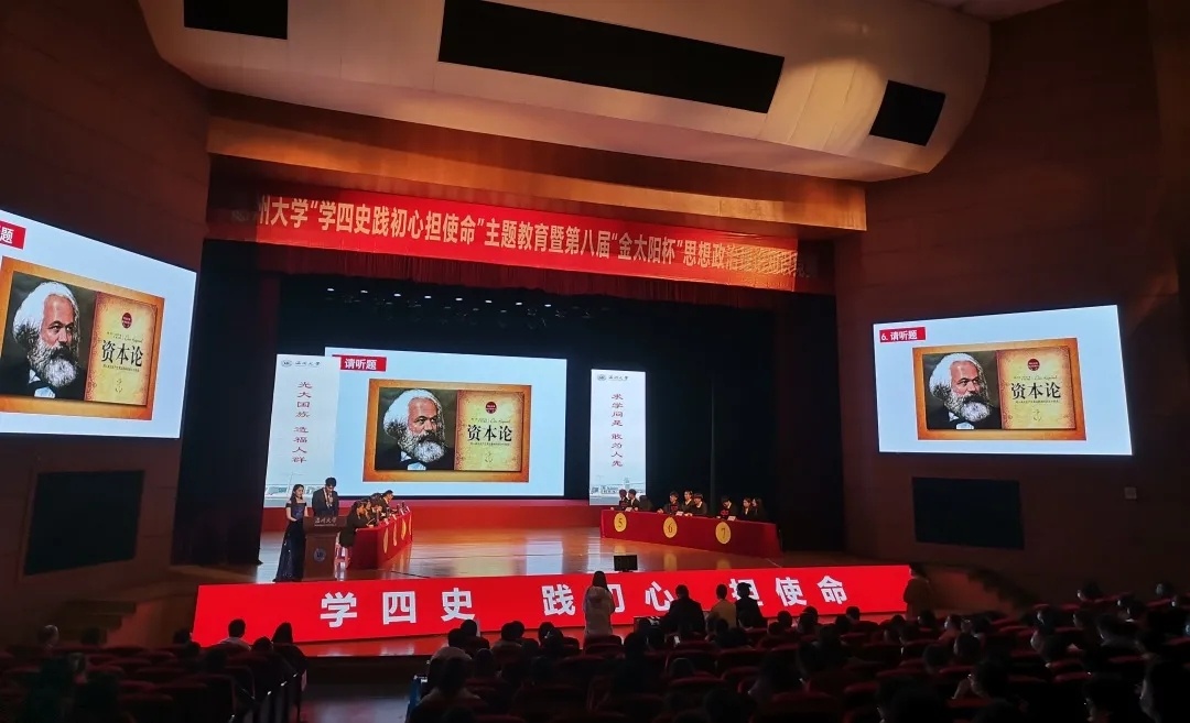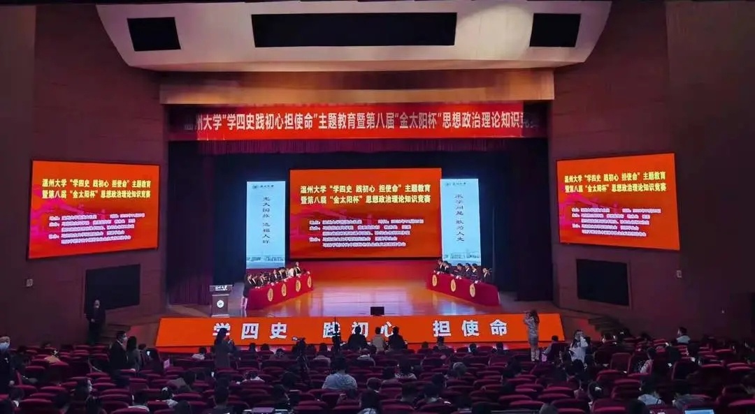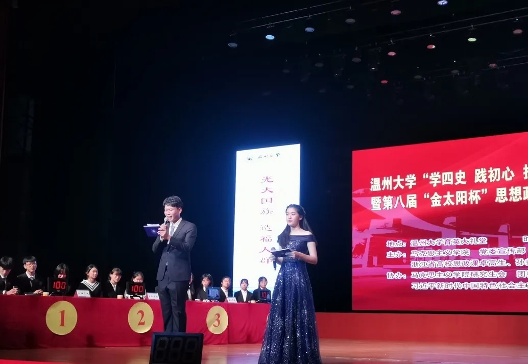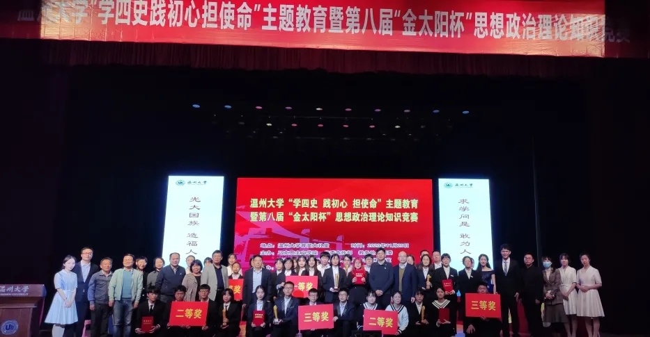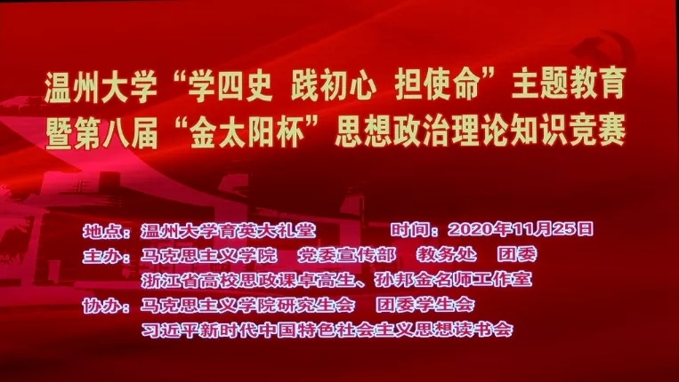 值此之际,为深入学习贯彻习近平新时代中国特色社会主义思想,特别是习近平总书记关于党史、新中国史、改革开放史、社会主义发展史的重要论述,检验大学生对“四史”知识掌握程度, 11月25日,满冠平台“学四史 践初心 担使命”主题教育暨第八届“金太阳杯”思想政治理论知识竞赛在满冠平台育英大礼堂隆重举行。本次竞赛活动由满冠平台马克思主义学院,党委宣传部,教务处,团委,浙江省高校思政课卓高生、孙邦金名师工作室联合主办,由马克主义学院研究生会、习近平新时代中国特色社会主义思想读书会协办。满冠平台党委副书记庄兴忠,党委委员、宣传部部长潘玉驹,校纪委副书记、纪检监察室主任杨立淮,教务处处长孙芙蓉,团委书记易招娣,马克思主义学院党委书记王柏民,院长卓高生,副院长孙邦金,副书记叶柏霜等领导亲临现场指导,并为获奖队伍颁奖。