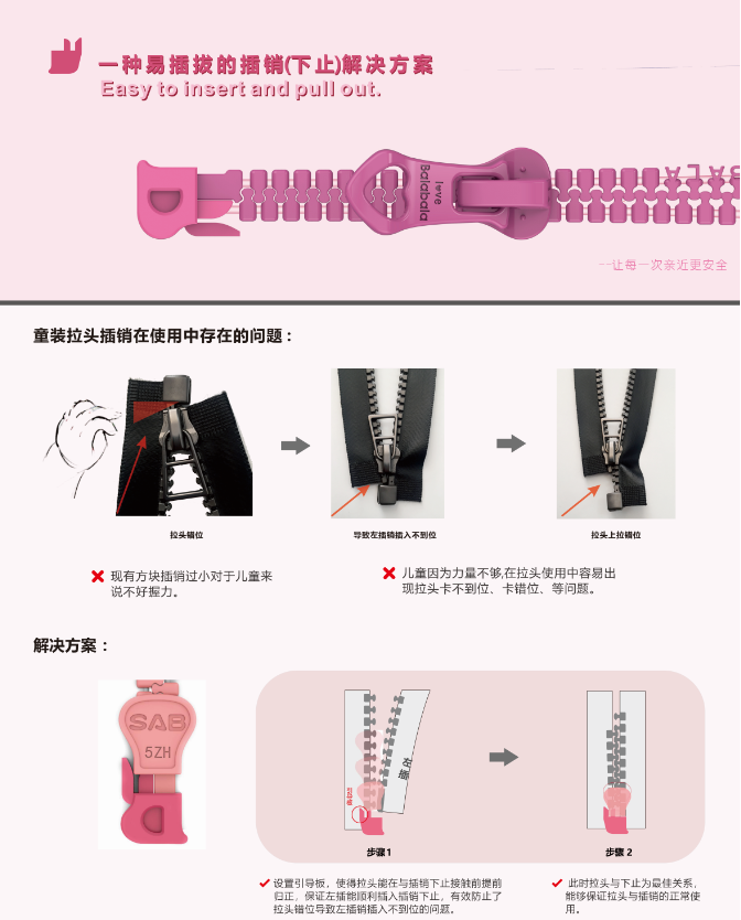 由于传统的童装拉链因拉头机芯立柱只存在上半部分,导致拉头在拉链上滑动重力分布不平衡,且现有的插销方块过小,儿童力量不够,因此在拉头使用中常常会产生拉头卡不到位、卡错位等问题。在该设计中,余明亮和团队创造性地在插头方块下设置了引导板,使得拉头能在与插销下止接触前提前归正,保证左插能顺利插入插销下止,有效防止了拉头错位导致左插销插入不到位的问题。