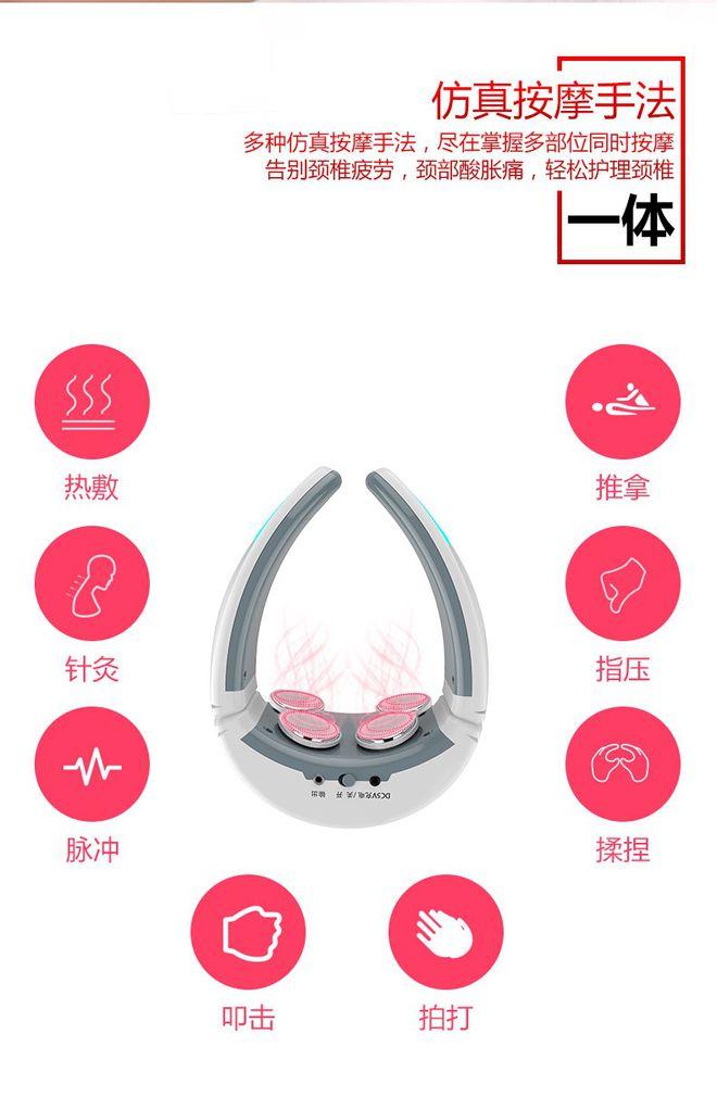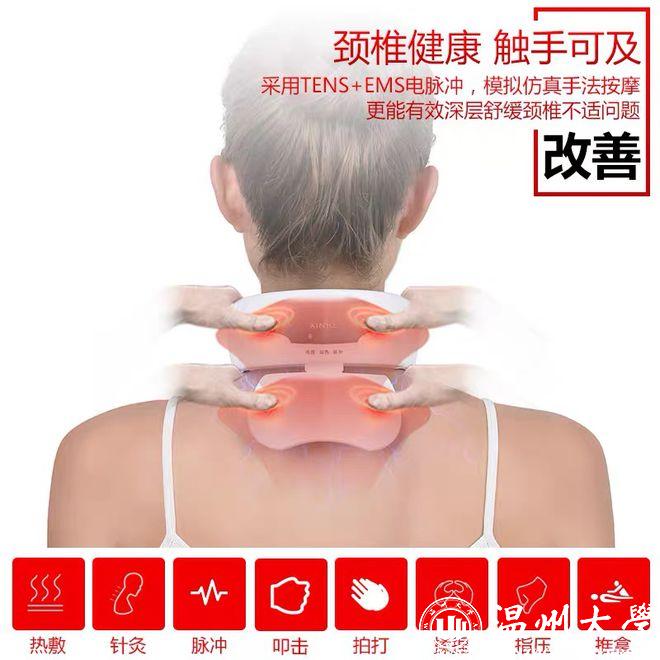 作品内置NTC传感器,实现智能控温和热敷温度的稳定。其外观形成了U型环颈贴合,可调节弹性臂。该按摩器支持多种充电接口,插头、电脑、充电宝均可为其充电,具有便捷性。2019年4月,设计团队为企业设计的“颈椎伸缩结构”获得了国家实用新型专利。