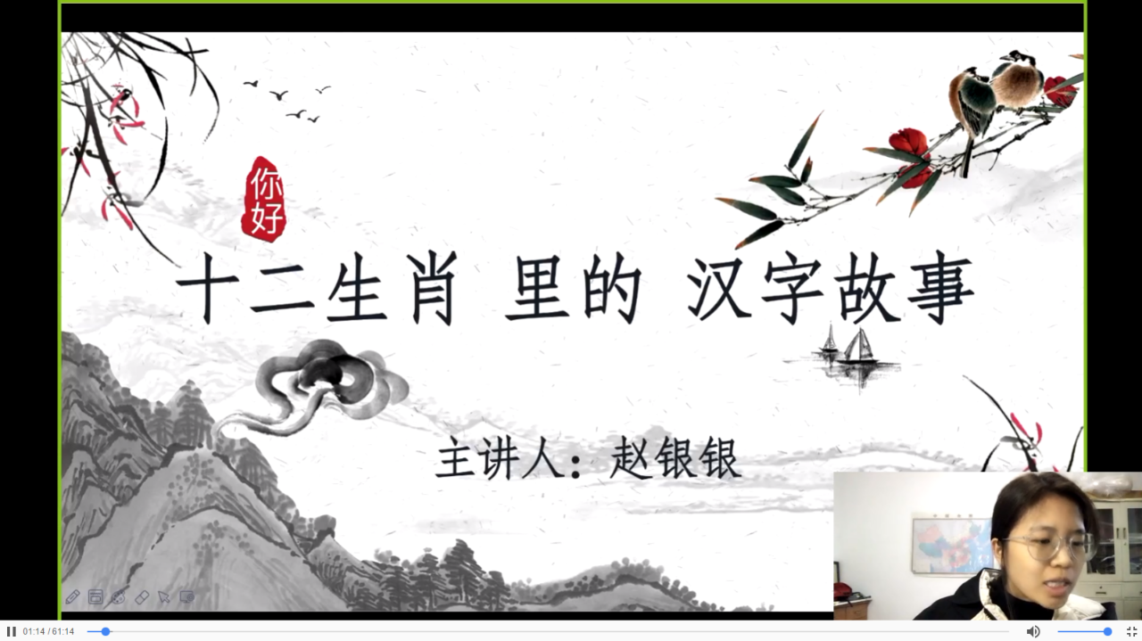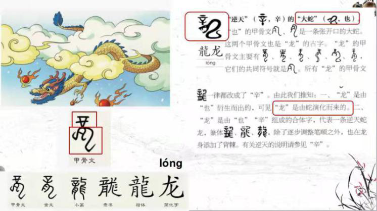 在此次云端课程中,浙江华侨网络学院还采用了“视、听、说”相结合、精讲多练的教学方法。从生动形象的动物汉字入手,以中国水墨画风格的《十二生肖》中排序的形成过程为引子,带领营员们一起观看视频,了解和认知十二生肖鼠、牛、虎、兔、龙、蛇、马、羊、猴、鸡、狗、猪。具体从龙和蛇入手,讲解汉字背后的故事及汉字的字形、字义,还结合汉字的演变,让学生们真真切切体会到汉字文化的源远流长。