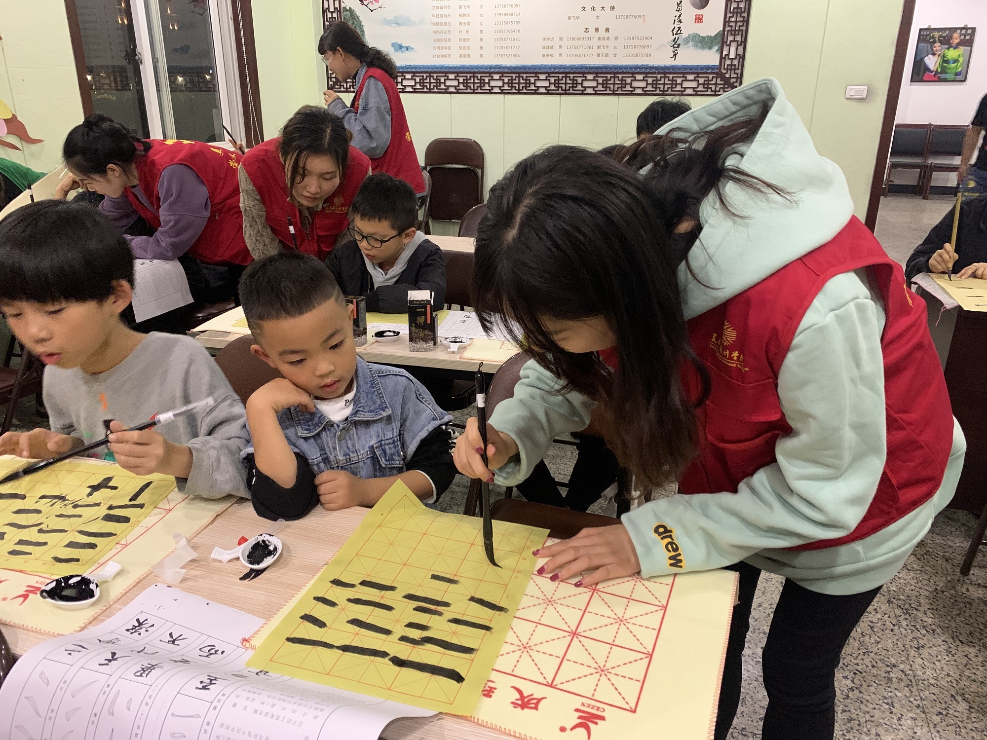 温大美院党员学生志愿者给侨乡儿童上软笔书法课