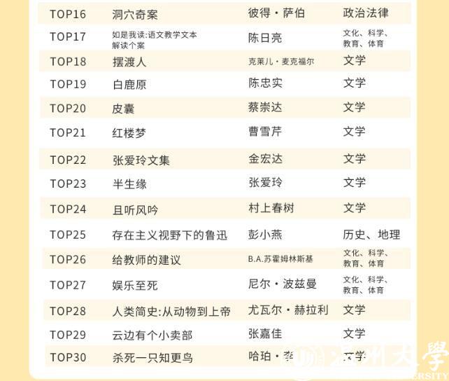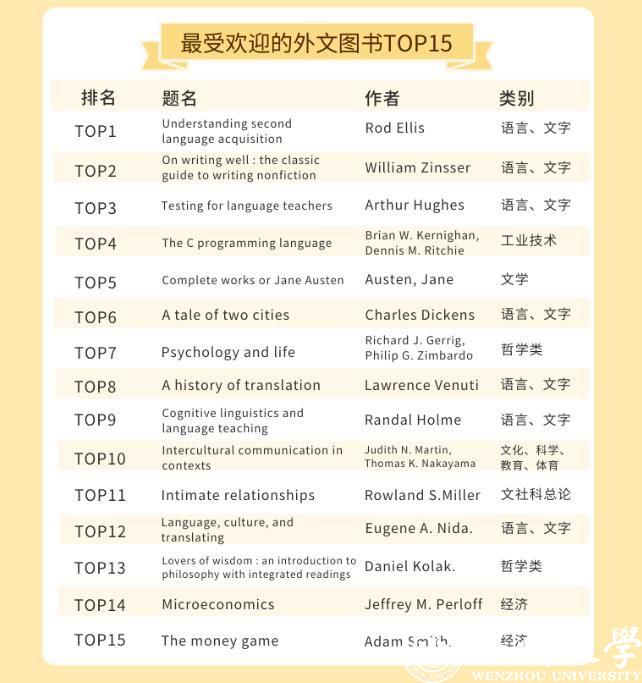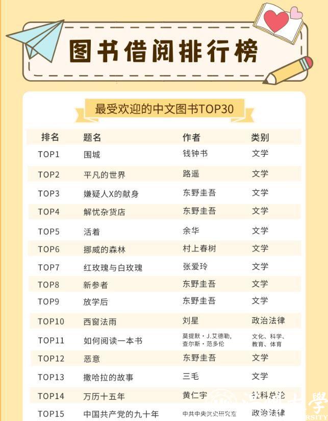 满冠平台的师生都喜欢借阅哪些中外文图书呢?在最受欢迎的中文图书TOP30榜单里,21本书为文学类别图书,占比达到70%。最受温大师生喜欢的书为钱钟书的《围城》,排在榜首。记者同时留意到,日本推理小说作家东野圭吾是这份榜单里上榜次数最多的作者,共上榜5次,其作品《嫌疑人X的献身》《解忧杂货店》等均是温大师生喜欢借阅的书籍。