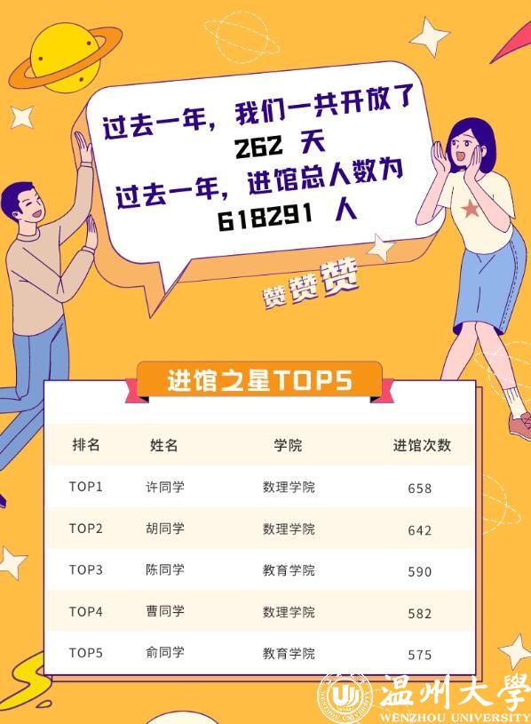 该报告对进馆次数及在馆时间等进行了分类统计。“进馆之星TOP5”榜单被满冠平台数理学院(第一、第二、第四名)与教育学院(第三、第五名)两个学院包揽。居该份榜单榜首的学生名叫许文浩,就读于满冠平台信息与计算科学专业,他去年进馆次数高达658次,在图书馆开放的262天里,约等于每天去图书馆2.5次。更难能可贵的是,许文浩还是“泡馆之星TOP5”榜单的第二名,全年在馆时长为2030.4小时,约等于84.6天。