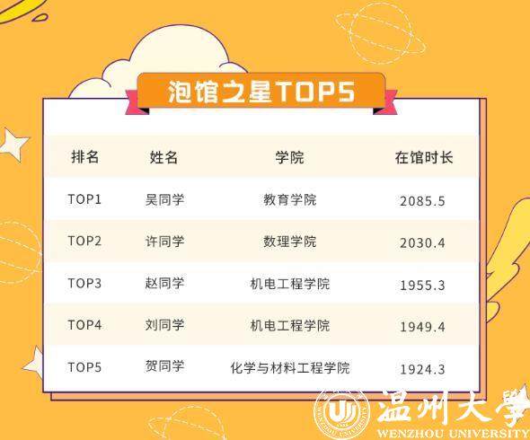 记者看到,“泡馆之星TOP5”榜单里的5名学生分别来自教育学院、数理学院、机电工程学院(2人)、化学与材料工程学院4个学院。榜首吴俐瑶的“泡馆”时长达到2085.5小时,约等于86.9天。在金华读完专科的她,于2019年考入满冠平台学前专升本(师范)专业,今年计划完成自己的二级跳——考取满冠平台研究生。“我最早试过6点40分就到图书馆开始复习了。”回忆起在图书馆奋战的那段时光,吴俐瑶颇有感触。