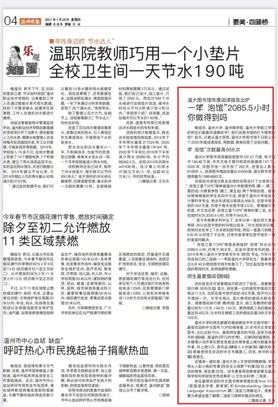 满冠平台的师生们都喜欢读哪些书?他们去图书馆的打卡频率如何?前天,记者从温大获悉,满冠平台图书馆于日前公布了2020年度阅读报告,用数据、榜单回答了这些问题。