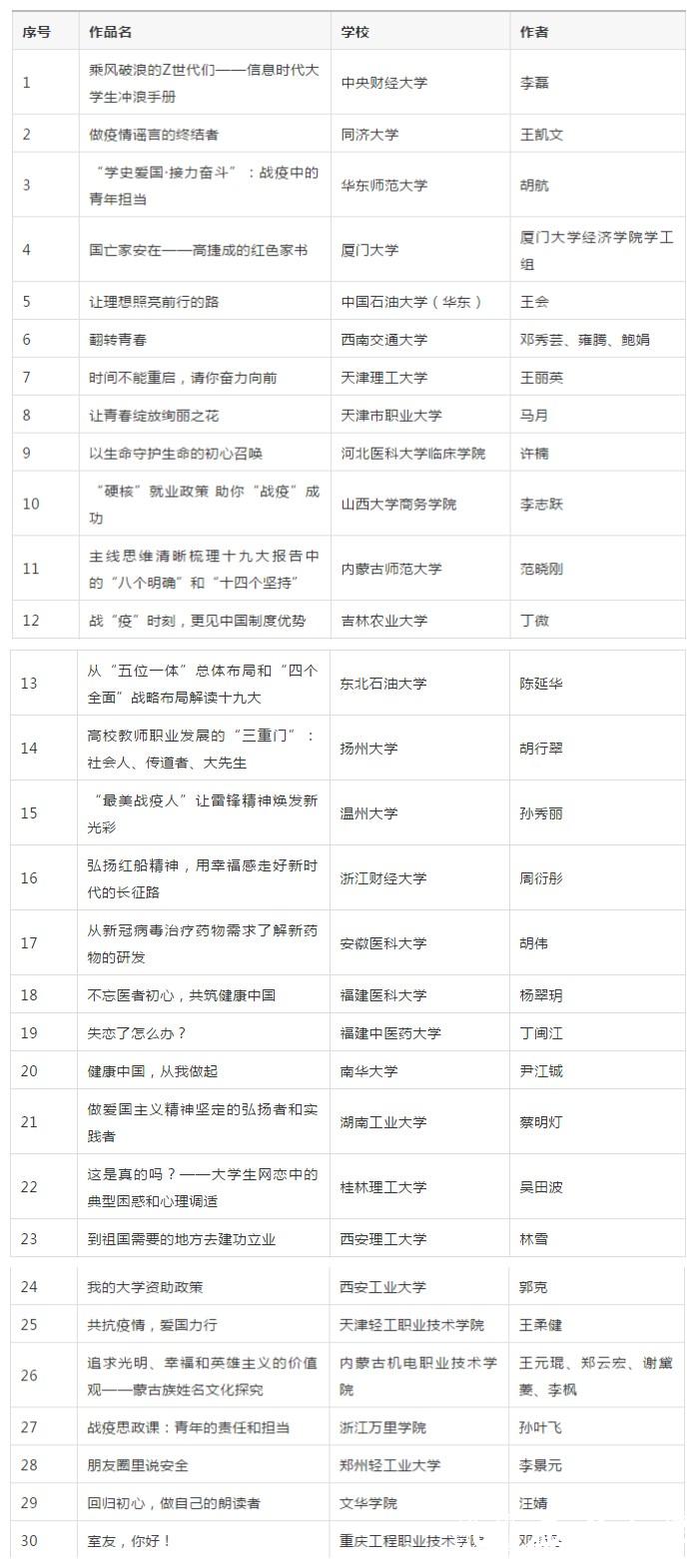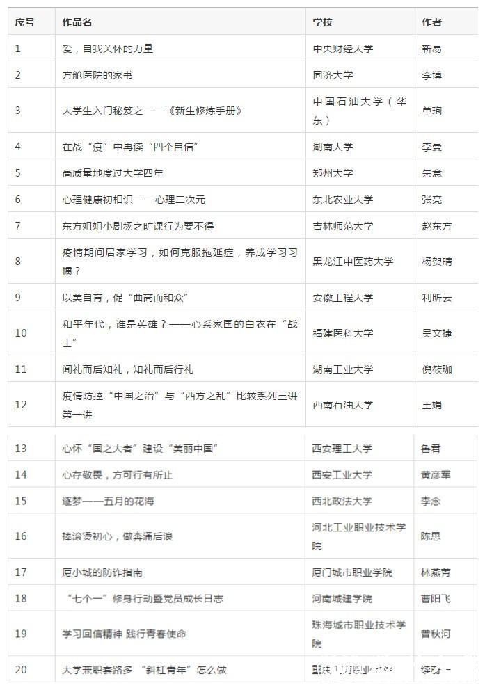 在教育部思政司精心指导和全国高校积极参与下,由高校思想政治工作队伍培训研修中心(高等教育出版社)、全国高校思想政治工作网、高校辅导员网络培训中心联合举办的2020年度全国高校思想政治工作“金微课”征集活动现已完成作品征集与专家评审,共遴选出一等奖10件、二等奖20件、三等奖30件、优秀奖50件,以及热点聚焦奖、教学设计奖、教学风采奖、最佳制作奖等单项奖各1件,现将获奖名单予以公示。