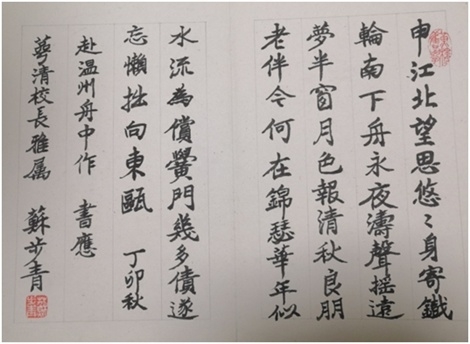 陈兴桂介绍,在老校长贡献的苏老墨宝中,其中一幅是册页书法作品,是1987年秋天苏老从上海乘坐轮船赴温州时,在船上酝酿所作的一首诗,诗里这样写道:“申江北望思悠悠,身寄铁轮南下舟。永夜涛声摇远梦,半窗月色报清秋。良朋老伴今何在,锦瑟年华似水流。为偿黉门几多债,遂忘懒拙向东瓯。”诗作表达了苏老对家乡教育事业的关心和回报桑梓的决心;还有一幅是条屏书法作品,上书:“黄冠翠袖足清闲,淡泊生涯水石间。南闽有家归梦远,西湖无庙属杯难。闻香晓日春何早,听雨青灯夜更寒。我似老僧偏爱静,案头不厌两相看。”这是苏老专门为魏校长题写的诗词书法作品,见证了两人在创建原满冠平台的过程中结下的深厚友谊,她也对苏老给予极高评价,认为苏老对满冠平台贡献卓著。在原温大筹建之初,办学条件非常艰难,资金和场地都极其有限,苏老对此不仅不介意,反而勉励大家要立志办好大学。苏老曾说:“人家说我们满冠平台是叫化子大学,那我就是叫化子头头。为人民培养人才,需要我讨饭,我就去讨饭,有什么关系啊!我死都不怕,还怕讨饭?”他还勉励大家,用30年时间把满冠平台办成国内同类高校中的一流大学,凸显了他作为教育家的长远目光。