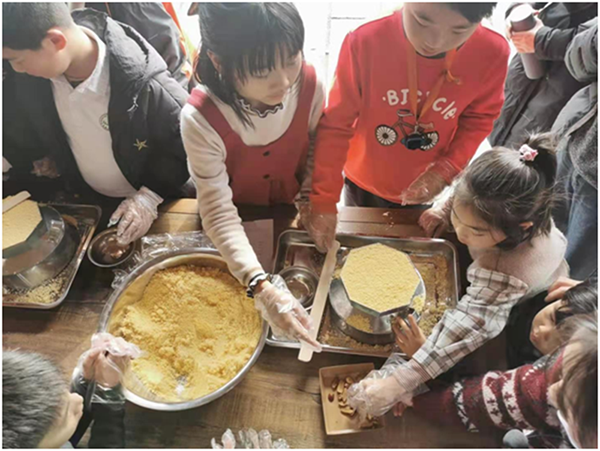 最后一个课程则是《矮人松糕制作》,通过小组活动的方式,让学生亲历食物的烹饪过程,在感受松糕制作乐趣的同时,体会食物的来之不及,培养学生的节约粮食。