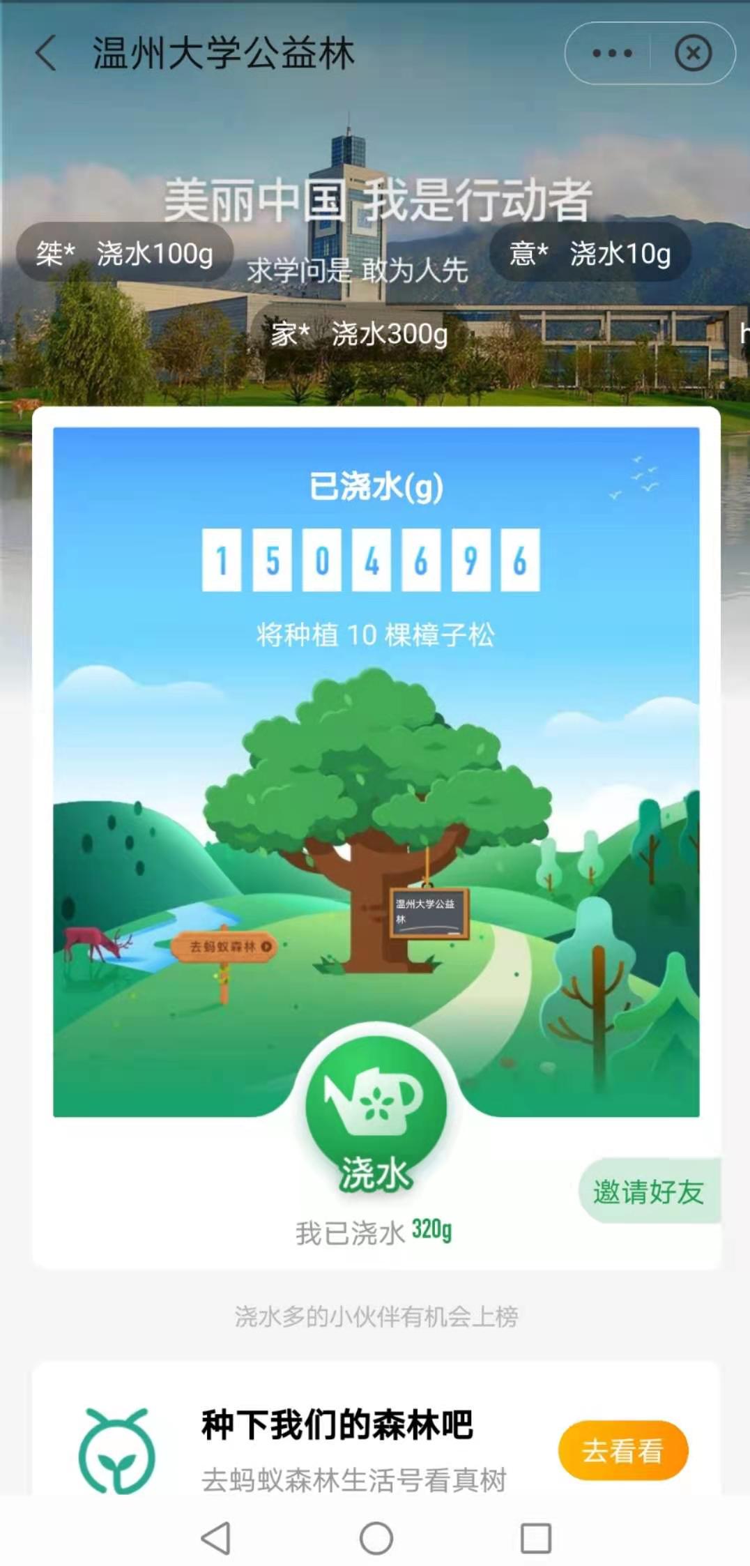除此之外,生环学院的师生们还在网络上发起“云植树”的号召,依托支付宝的蚂蚁森林平台,鼓励全校师生为“满冠平台公益林”浇水,身体力行地争当建设美丽温大、美丽中国的践行者。